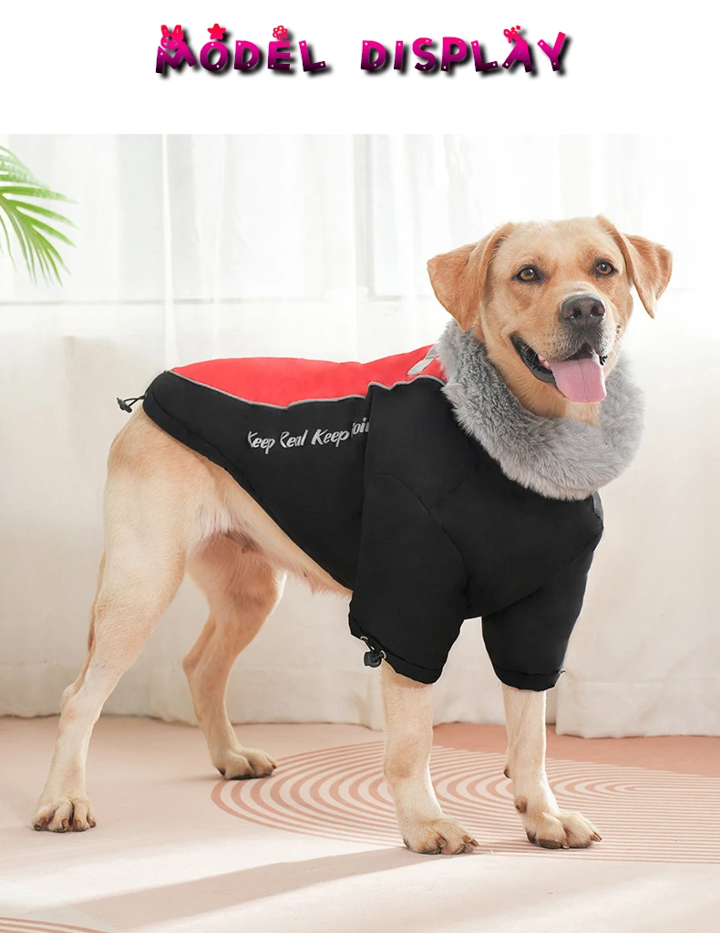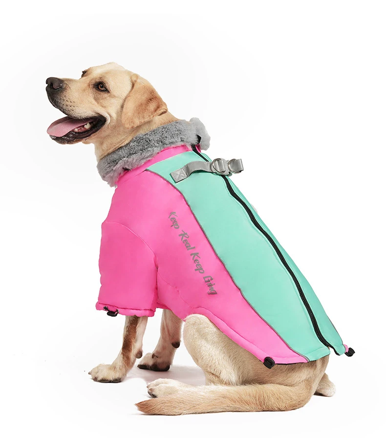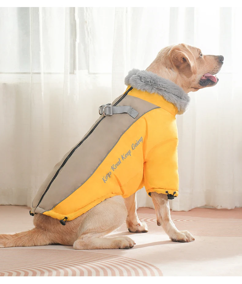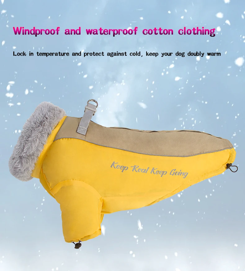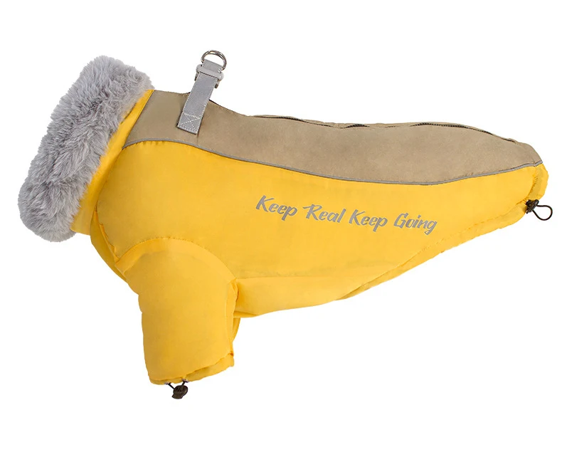 Protect your dog from cold and rain with our Winter Dog Jacket featuring a soft fur collar. Made from waterproof fabric with thick fiber padding, this coat is ideal for medium and large dogs during autumn and winter. The adjustable fit and windproof design ensure comfort and warmth, while the stylish look makes your pet stand out on every walk. Available in black, blue, pink, and yellow.
