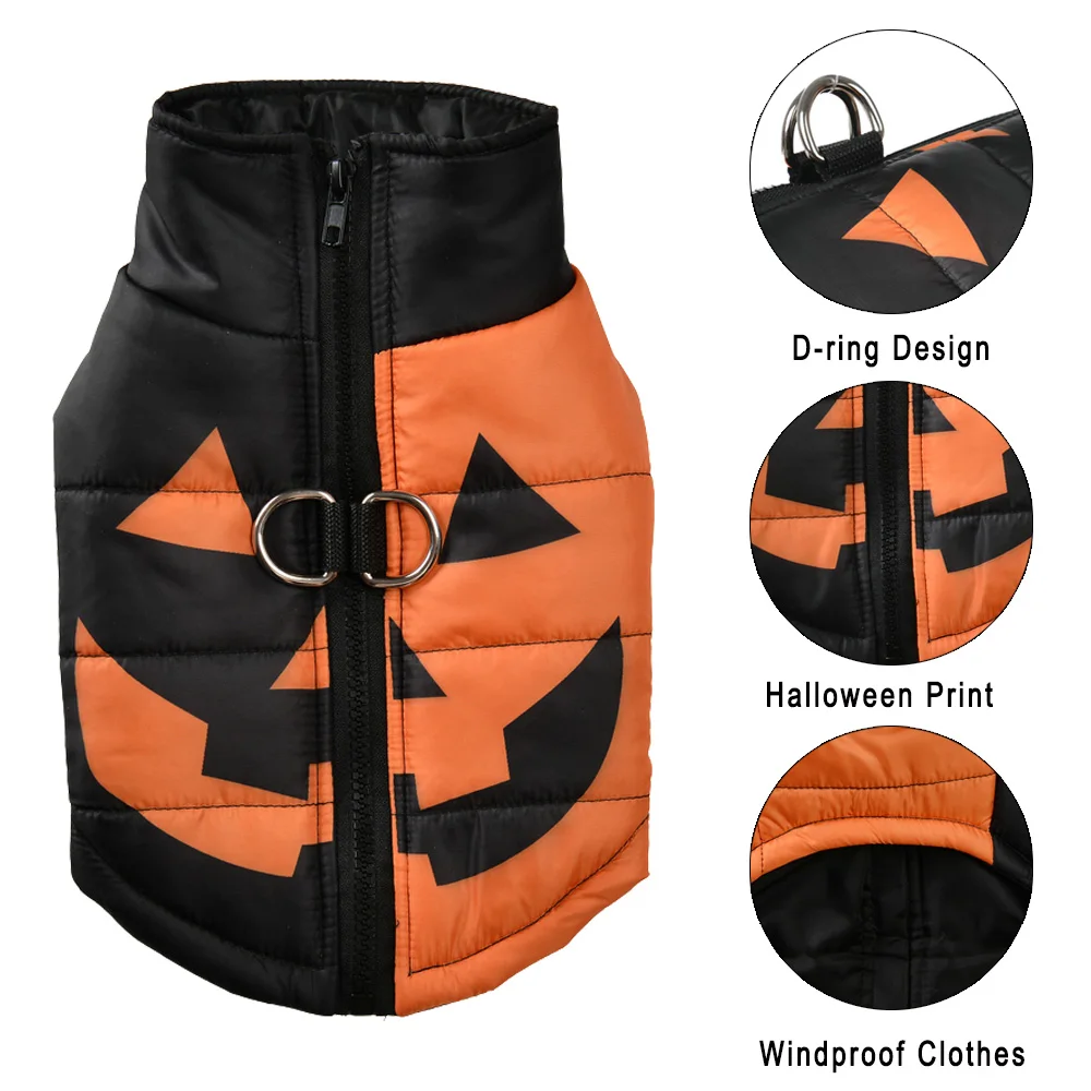Celebrate Halloween in style with this warm cosplay dog jacket. Featuring fun pumpkin prints, a windproof design, and a comfortable padded lining, it’s perfect for keeping your pet cozy during autumn and winter festivities. Suitable for small and medium dogs as well as cats.